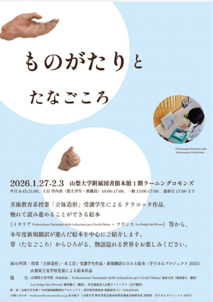 絵本展示については山梨大学・山梨県立盲学校との連携、イタリア全国視覚障害者支援施設連盟や作家達の協力によりご紹介します。これらのさわる絵本は日本ではまだあまり紹介されていない作品も多く、新規の翻訳・点訳作品を中心に公開していきます。また、触覚を活用したワークショップ実践のポスター等もあわせてご紹介します。子どもも大人もアクセシビリティをひろげてお楽しみいただける取り組みを目指しています。