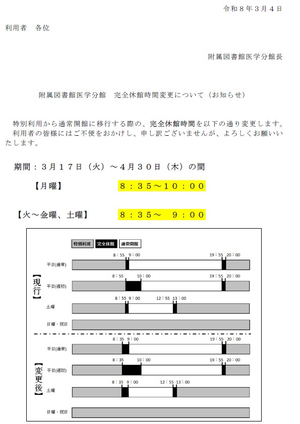 諸事情により、以下の期間、附属図書館医学分館(医学部キャンパス)の開館時間を変更(短縮)いたします。